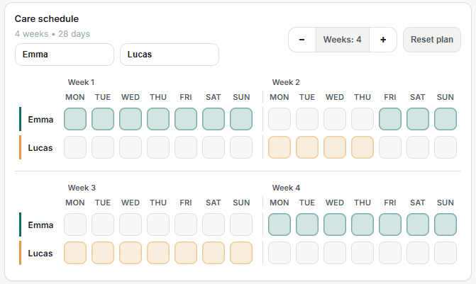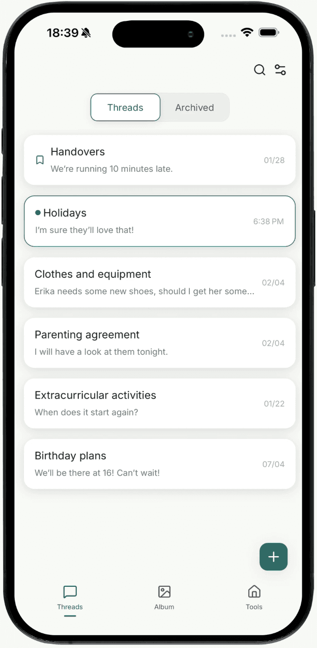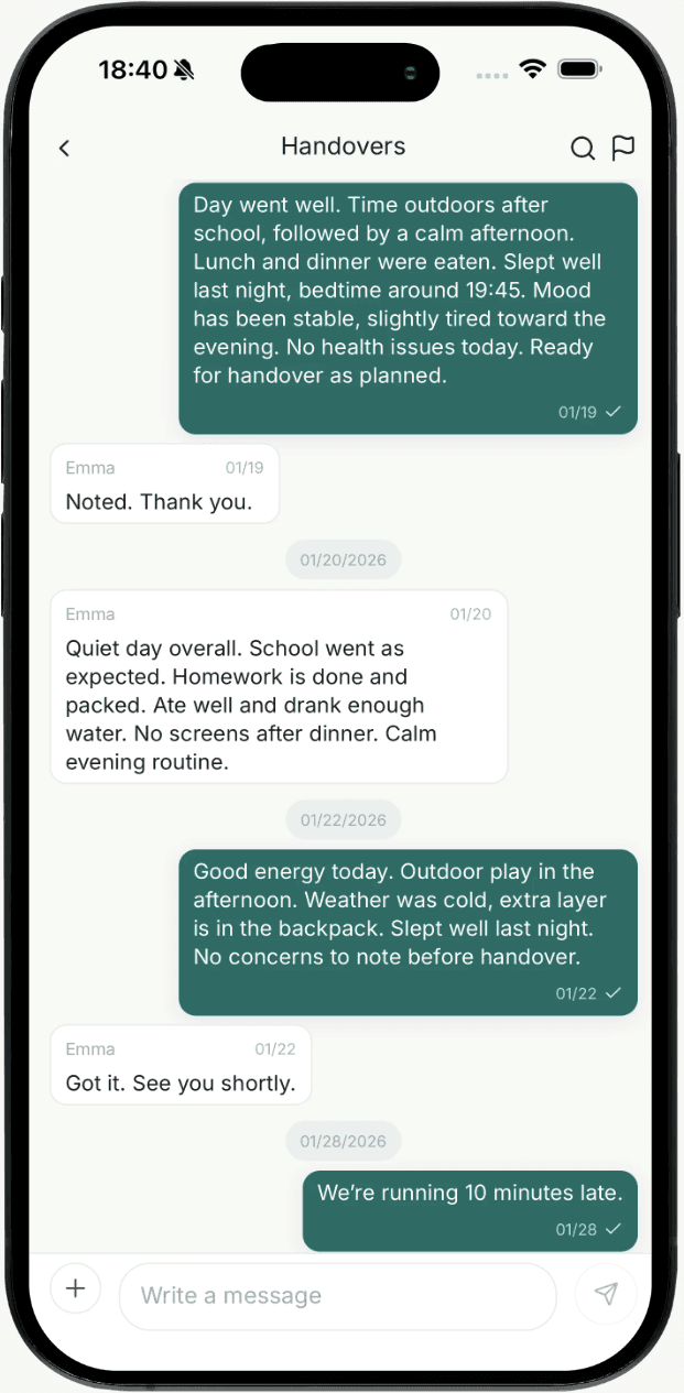 Lina is made for parents who share care across homes and want fewer misunderstandings in everyday life. It is for those who value structure over noise and clarity over constant messaging. The structure supports cooperation regardless of conflict level, and helps create predictability even when communication feels difficult.